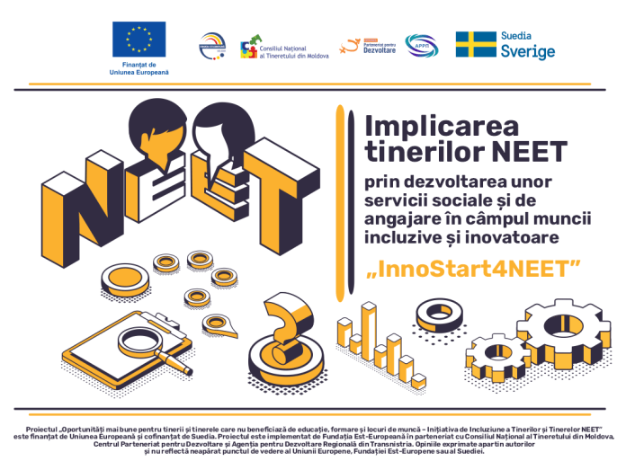 The Project “Better opportunities for Young Women and Men Not in Education, Employment and Training in Moldova (NEET Inclusion Initiative)” is funded by the European Union, co-funded by Sweden and implemented through East Europe Foundation in partnership with the National Youth Council of Moldova (NYC), Centre Partnership for Development (CPD), Agency for Regional Development from the Transnistrian region (ARD).