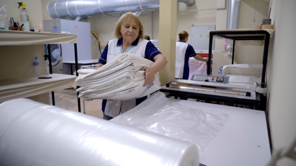 Practicile de a fi cât mai prietenoși mediului, fondatoarea companiei spune că le preia de la expozițiile europene la care participă. De acolo aduc la Ungheni cele mai bune practici și soluții pentru curățarea țesăturilor.