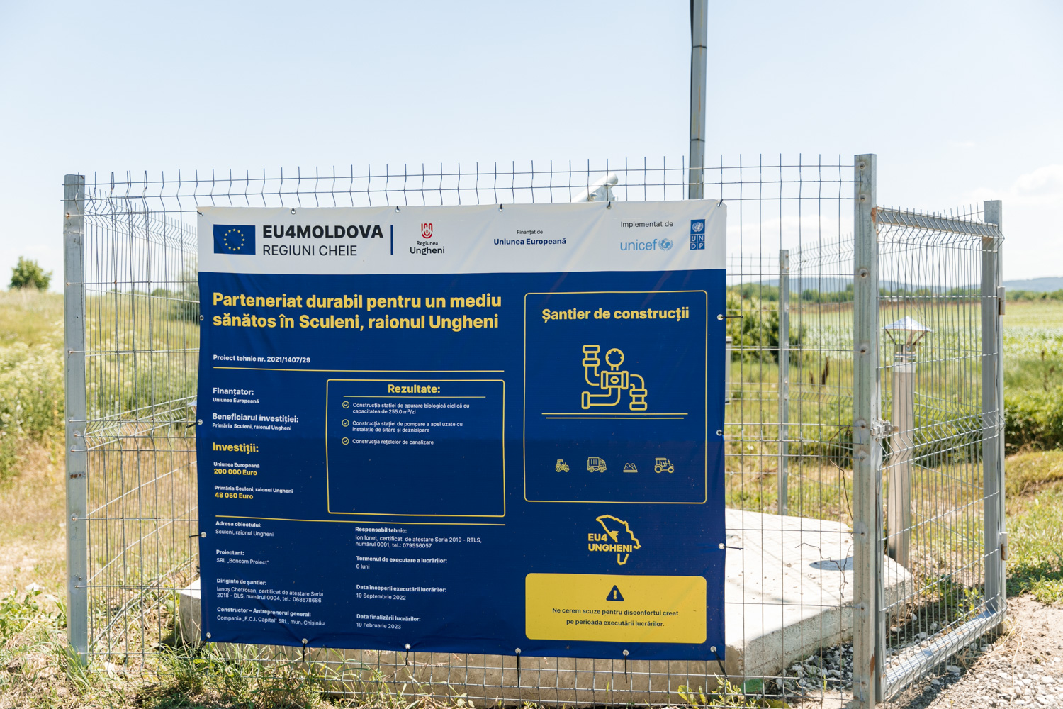 Lucrările în valoare de peste 200.000 euro au fost efectuate cu sprijinul programului „EU4Moldova: Regiuni-cheie”, finanțat de UE și implementat de PNUD și UNICEF și cu contribuția primăriei Sculeni. A fost construită o staţie de epurare biologică ciclică și o stație de pompare a apei uzate cu instalație de sitare și deznisipare și au fost instalate rețelele de canalizare.
