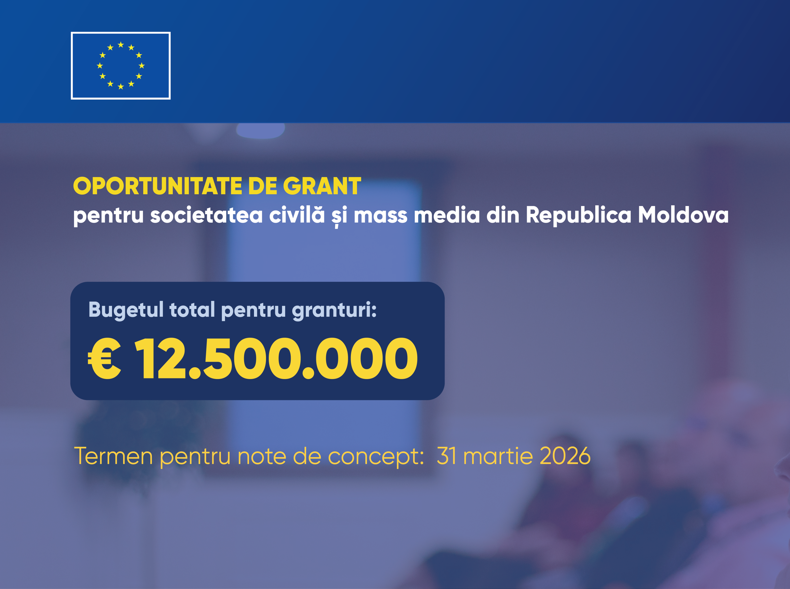 Основная цель конкурса заключается в укреплении потенциала организаций гражданского общества и независимых СМИ в Республике Молдова для эффективной поддержки и содействия процессу присоединения страны к ЕС. Мероприятие направлено на расширение возможности ОГО и СМИ играть активную и влиятельную роль в содействии открытому и конструктивному диалогу с представителями государственных органов, продвижении демократического управления и устойчивого развития, укреплении социальной сплоченности и повышении устойчивости сообществ к дезинформации.