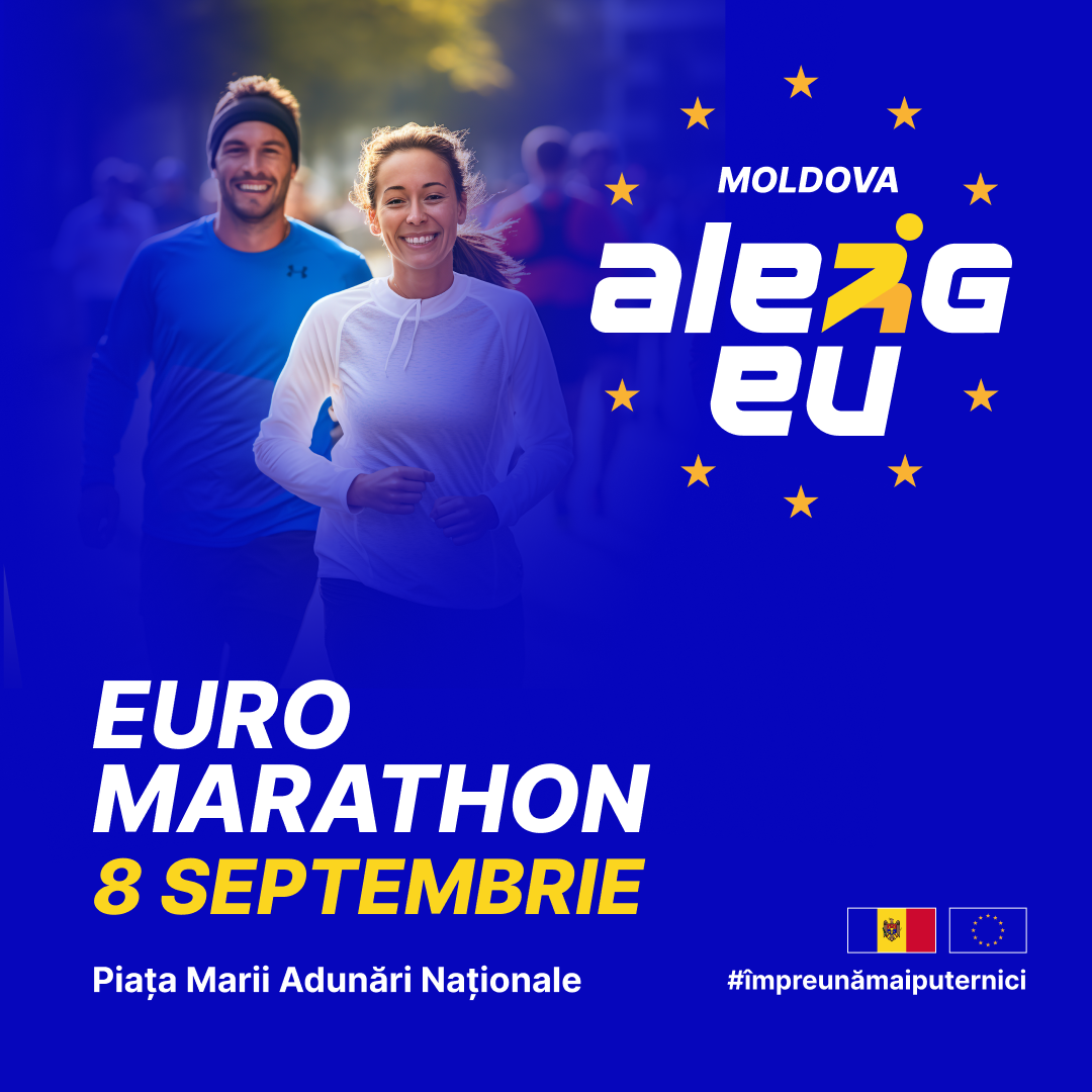 Hai la start la Euro Marathon! Pe 8 septembrie 2024, ne adunăm în Piața Marii Adunări Naționale, la un eveniment unic în Moldova, să alergăm pentru o Moldovă prosperă și europeană.